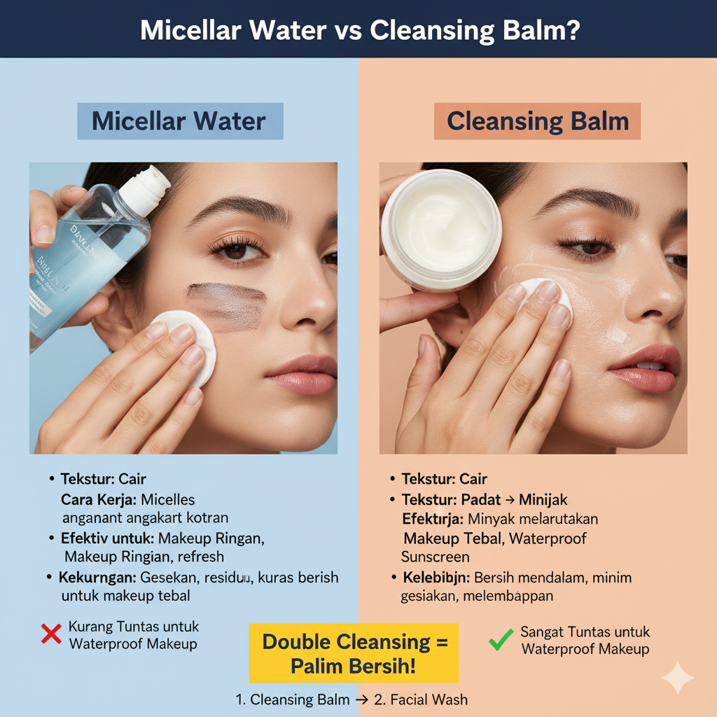 • Untuk makeup berat atau aktivitas di luar ruangan sepanjang hari, cleansing balm menjadi pilihan yang lebih tepat.