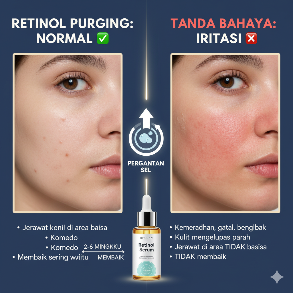Retinol purging adalah respons normal dan sementara dari kulit saat beradaptasi dengan retinoid. Ini adalah tanda bahwa produk bekerja untuk mempercepat pergantian sel dan membersihkan pori. Namun, jika gejala yang Anda alami adalah kemerahan parah, rasa sakit, gatal, atau bengkak di area yang tidak biasa, itu kemungkinan besar adalah iritasi dan Anda harus menghentikan atau mengurangi penggunaan retinol.
